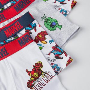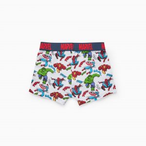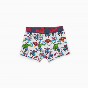 Pack de cuatro boxers Marvel para niño, de algodón y elastán para un mayor confort. Incluye boxers de tonos gris, blanco y azul, estampados con patrones y motivos de Los Vengadores: Hulk, Capitán América, Ironman y el Hombre Araña. Cintura elástica. Bolsita incluida.