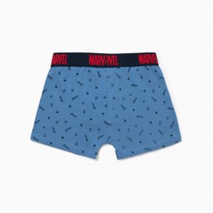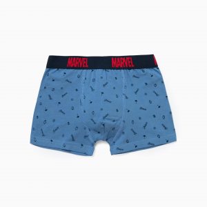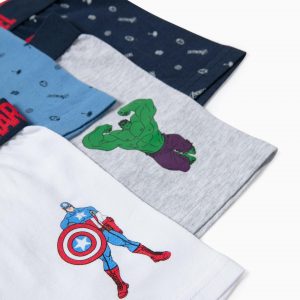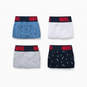 Pack de cuatro boxers Marvel para niño, de algodón y elastán. Incluye boxers de colores gris, azul, rojo y blanco, dos lisos con un pequeño estampado lateral y dos con motivo de Los Vengadores. Cintura elástica. Corte mejorado y más confortable. Bolsita incluida.