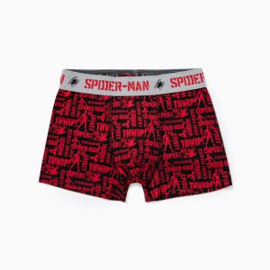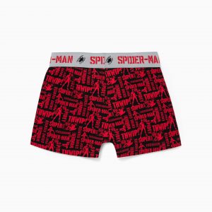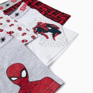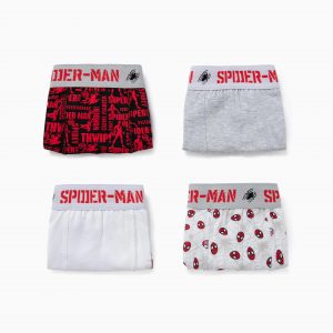 Pack de cuatro boxers Marvel para niño, de algodón y elastán. Incluye boxers de colores gris, negro, rojo y blanco, dos lisos con un pequeño estampado lateral y dos con motivo del Hombre Araña. Cintura elástica. Corte mejorado y más confortable. Bolsita incluida.