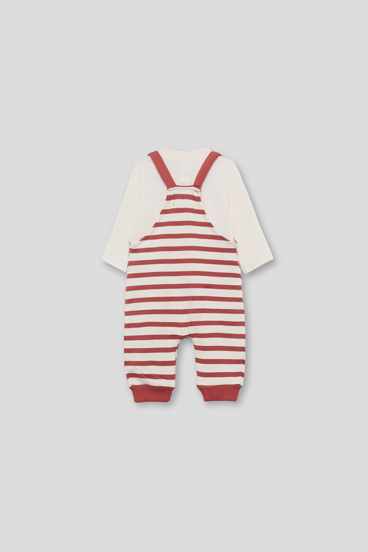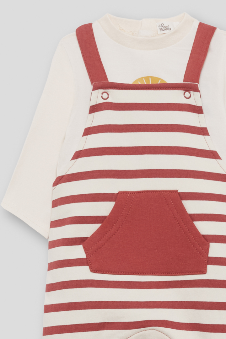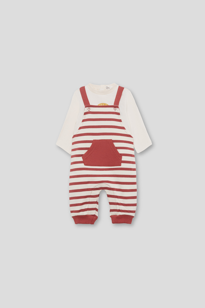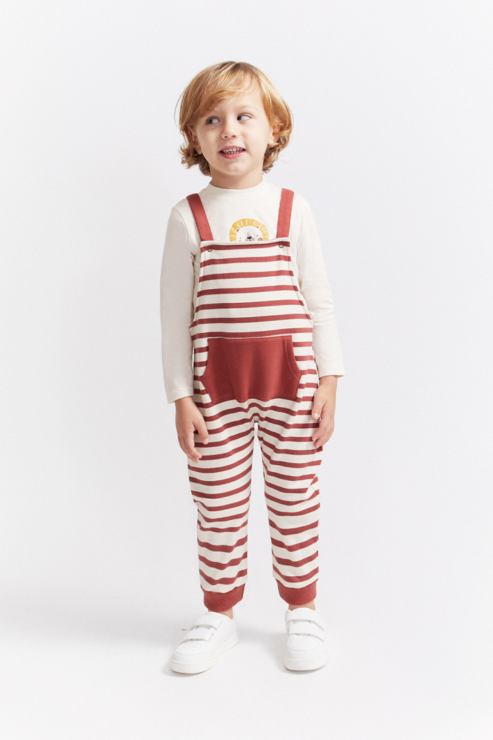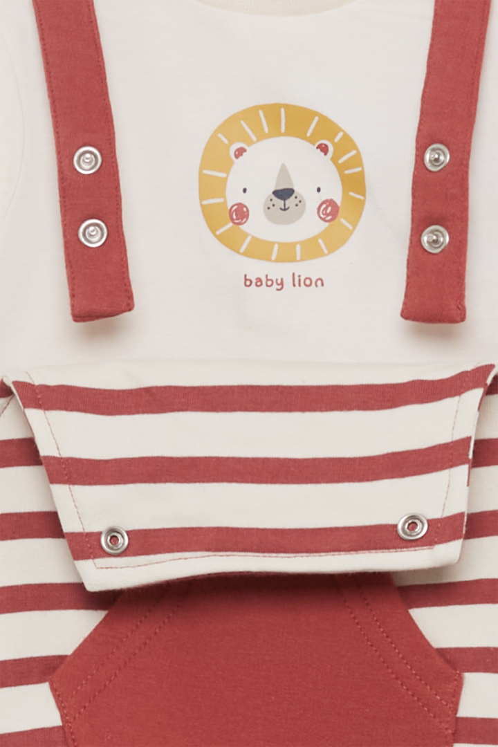 Conjunto de dos piezas para recién nacido niño, compuesto por peto largo en color crudo con rayas teja y camiseta a juego con estampado de león. El peto incluye tirantes con botones decorativos, bolsillo canguro y bajos acabados en puño para un ajuste cómodo. La camiseta es de manga larga, cuello redondo y cierre trasero con corchetes. Un conjunto práctico, cálido y con mucho estilo para bebés de 1 a 24 meses.