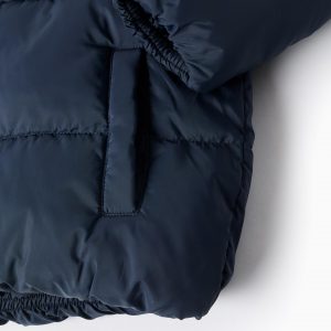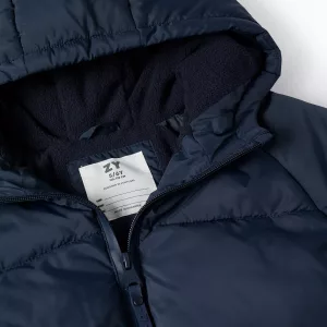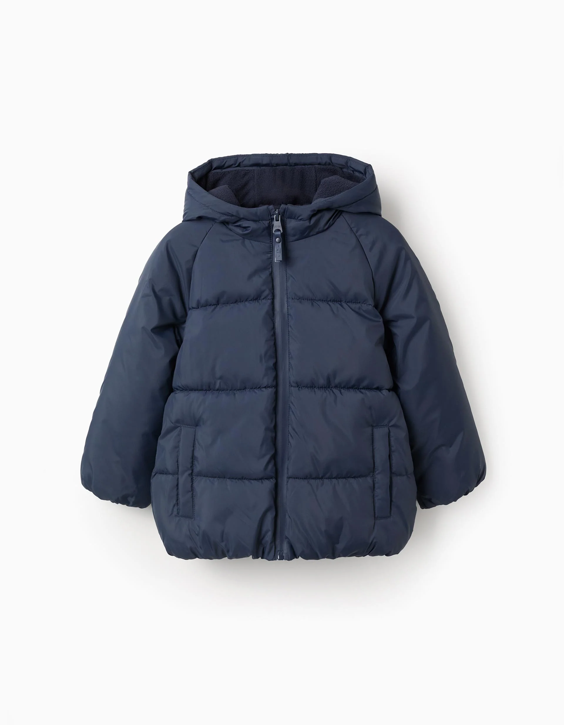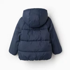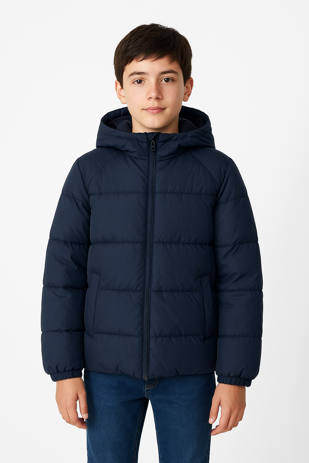 Chaqueta acolchada para niño en color azul oscuro, diseñada para ofrecer calidez y confort en los días más fríos. Cuenta con capucha fija, cierre de cremallera frontal y prácticos bolsillos laterales.