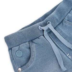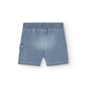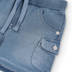 Bermuda de felpa tejanera elástica de niño en color bleach, se ajusta a la cintura con una pieza de canalé con goma interior y cordón. Lleva un bolsillo lateral con solapa y se cierra con un botón. La decoración es una etiqueta con detalle de la marca. Esta prenda lleva unos desgastados que le dan un aspecto más envejecido.