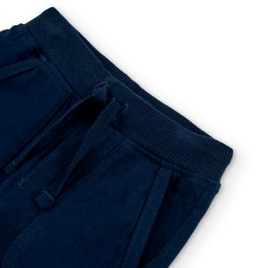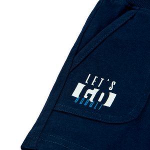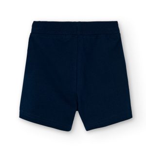 Bermudas de niño de punto liso en color marino. La cintura es de canalé del mismo color y se ajusta con goma interior y tiene como detalle un cordón para regular la cintura del mismo color. Lleva como detalle una unas letras estampadas en varios colores, en el bolsillo.