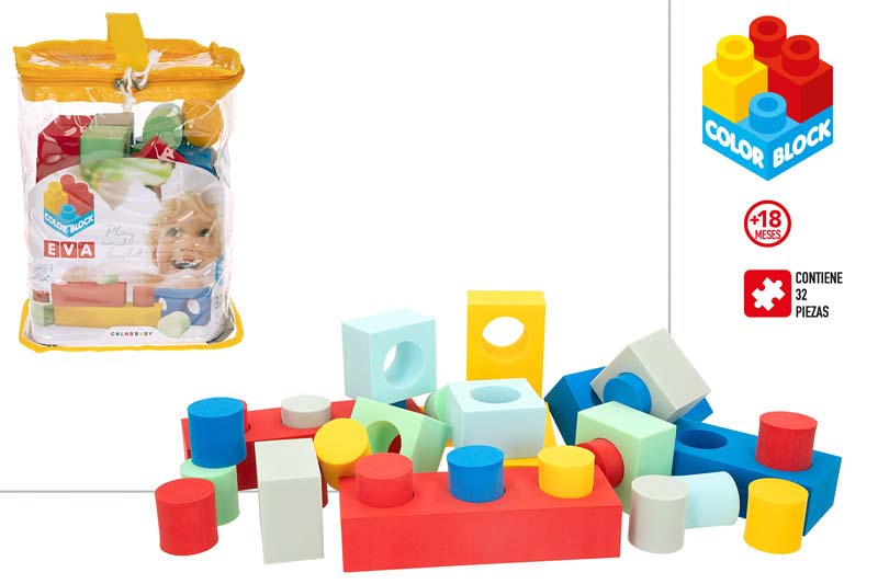 ¡Construye todo lo que imagines con este juego de bloques de gomaeva Color Block! Este juego de construcción de bloques está compuesto por 32 piezas de foam, resistentes al agua y con textura suave, que vienen dentro de una bolsa transparente con asa y cremallera para que los puedas guardar y transportar a cualquier parte.