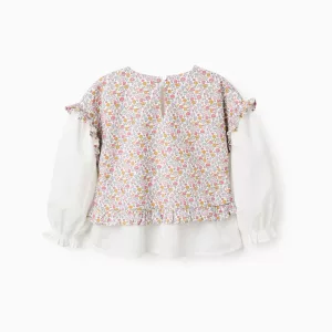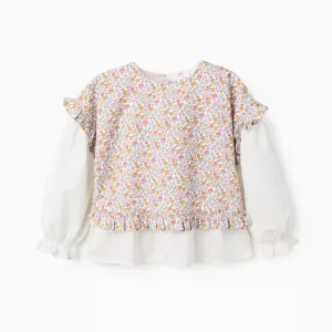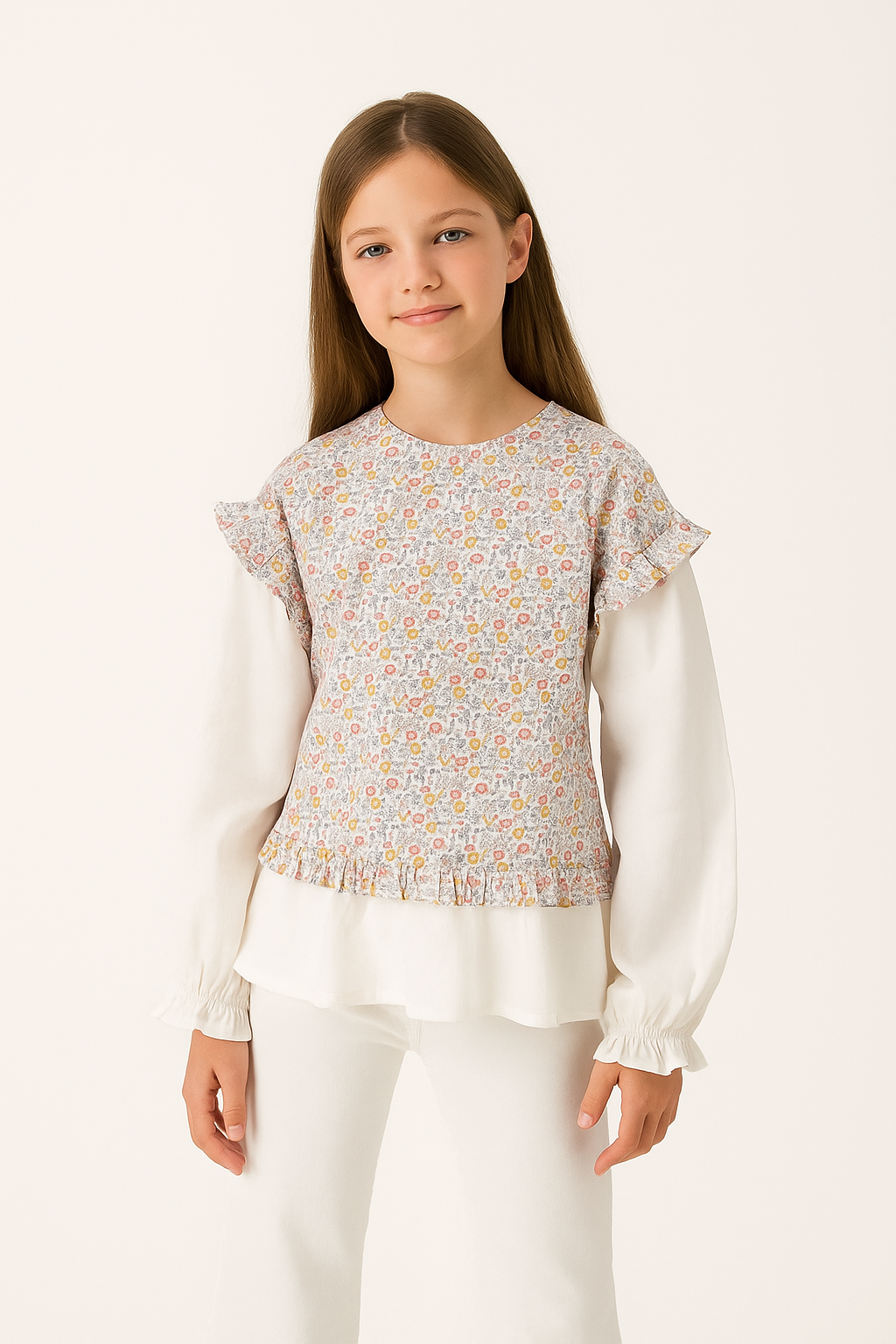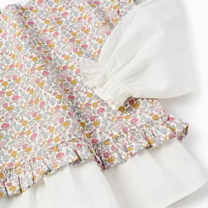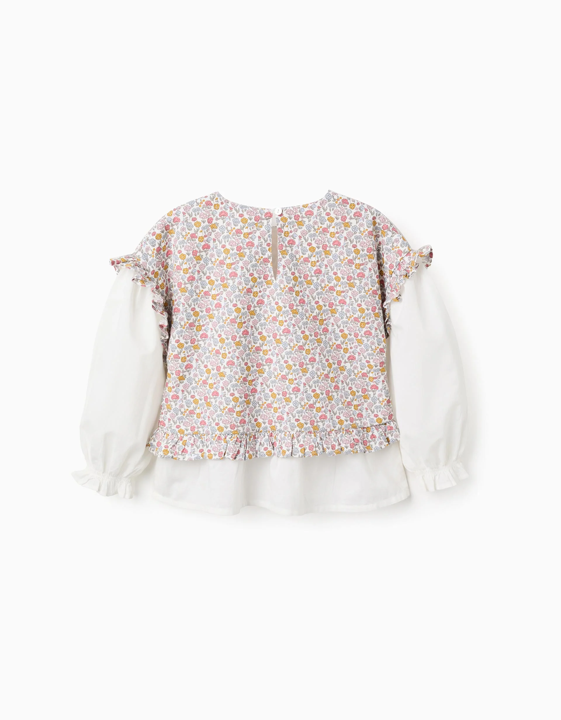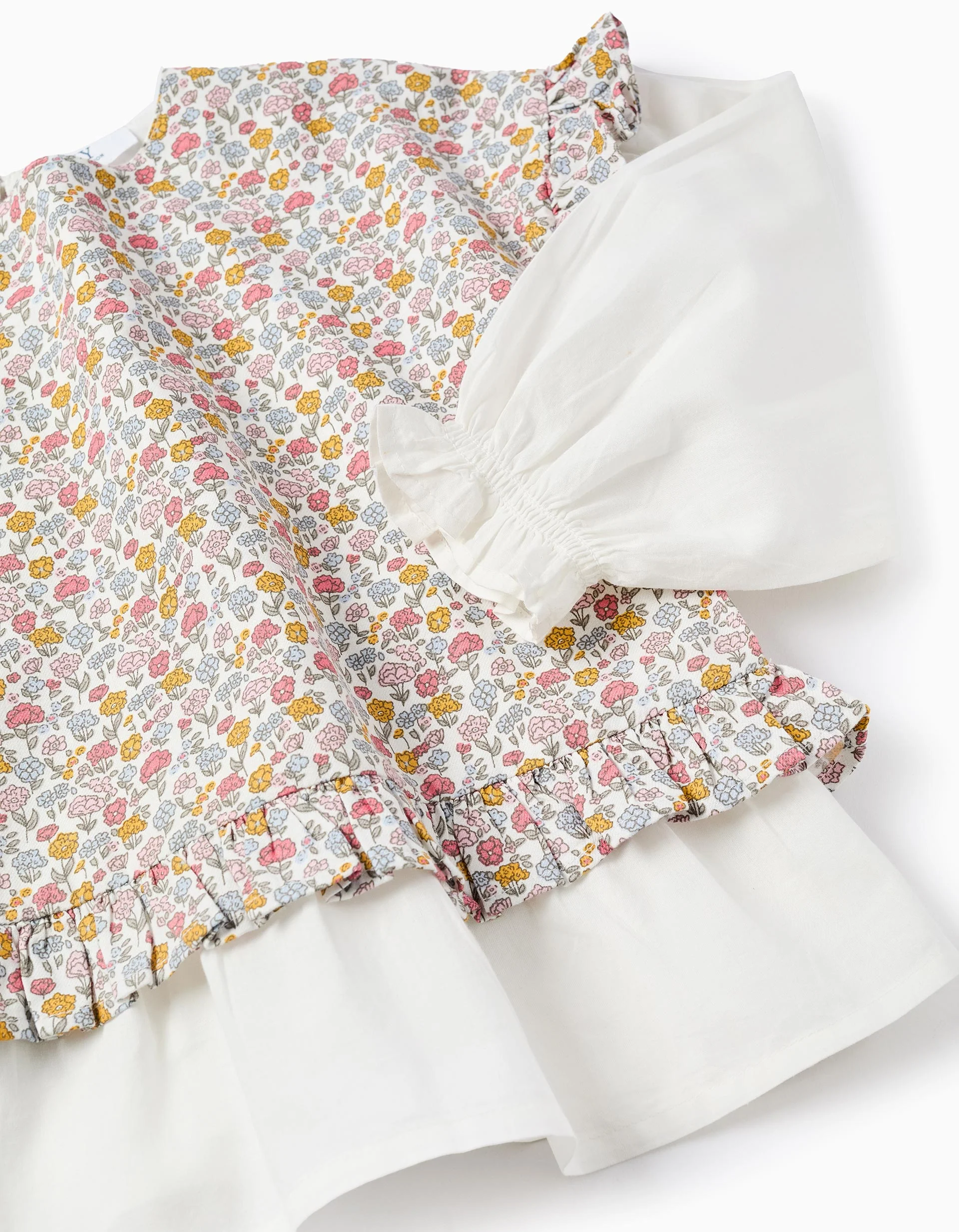 Blusa combinada para niña, 100% algodón: Mangas y base en tejido blanco y cuerpo con motivo floral en tonos de blanco, amarillo, rosa y azul. Volantes en los hombros y en la base. Botón en la espalda. Con forro. ¡Una opción colorida y original!
