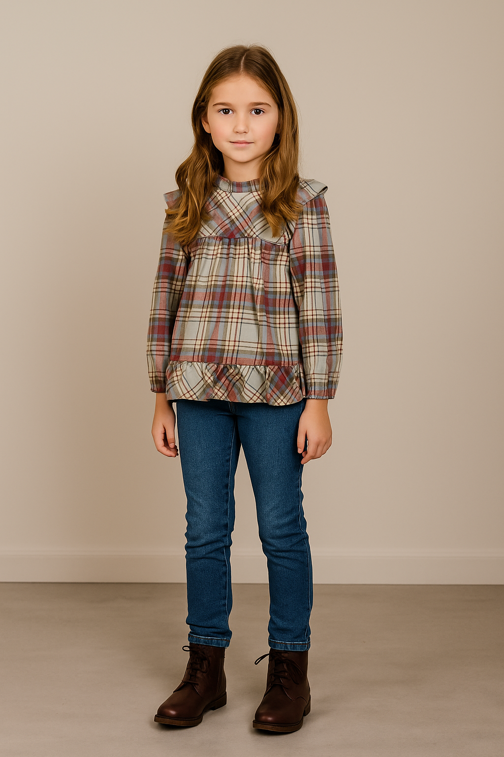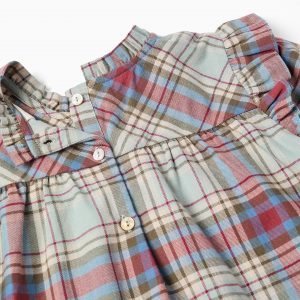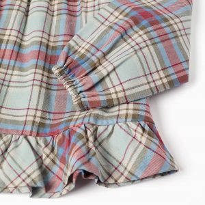 Presentamos esta blusa clásica para niña. Con un precioso estampado de cuadros en tonos verde claro y oscuro, azul, beige, rojo y marrón, esta prenda es ideal para eventos especiales. La tela suave y transpirable proporciona comodidad durante todo el día, mientras que los detalles de volantes alrededor del cuello y en el dobladillo añaden un toque de elegancia. ¡Para looks elegantes, coordinados entre hermanos y hermanas!