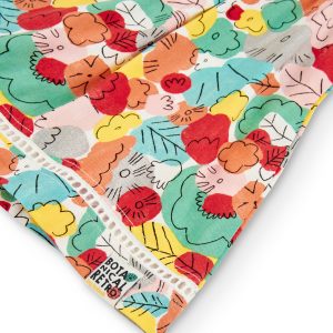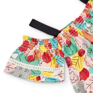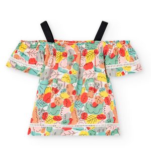 Blusa en tejido de viscosa estampada para niña. La blusa tiene los tirantes a contraste y las mangas del mismo tejido que el cuerpo. Tiene el escote engomado con goma canilla y forma un fruncido tipo nido de abeja. En el bajo tiene confeccionado una fornitura semitransparente.