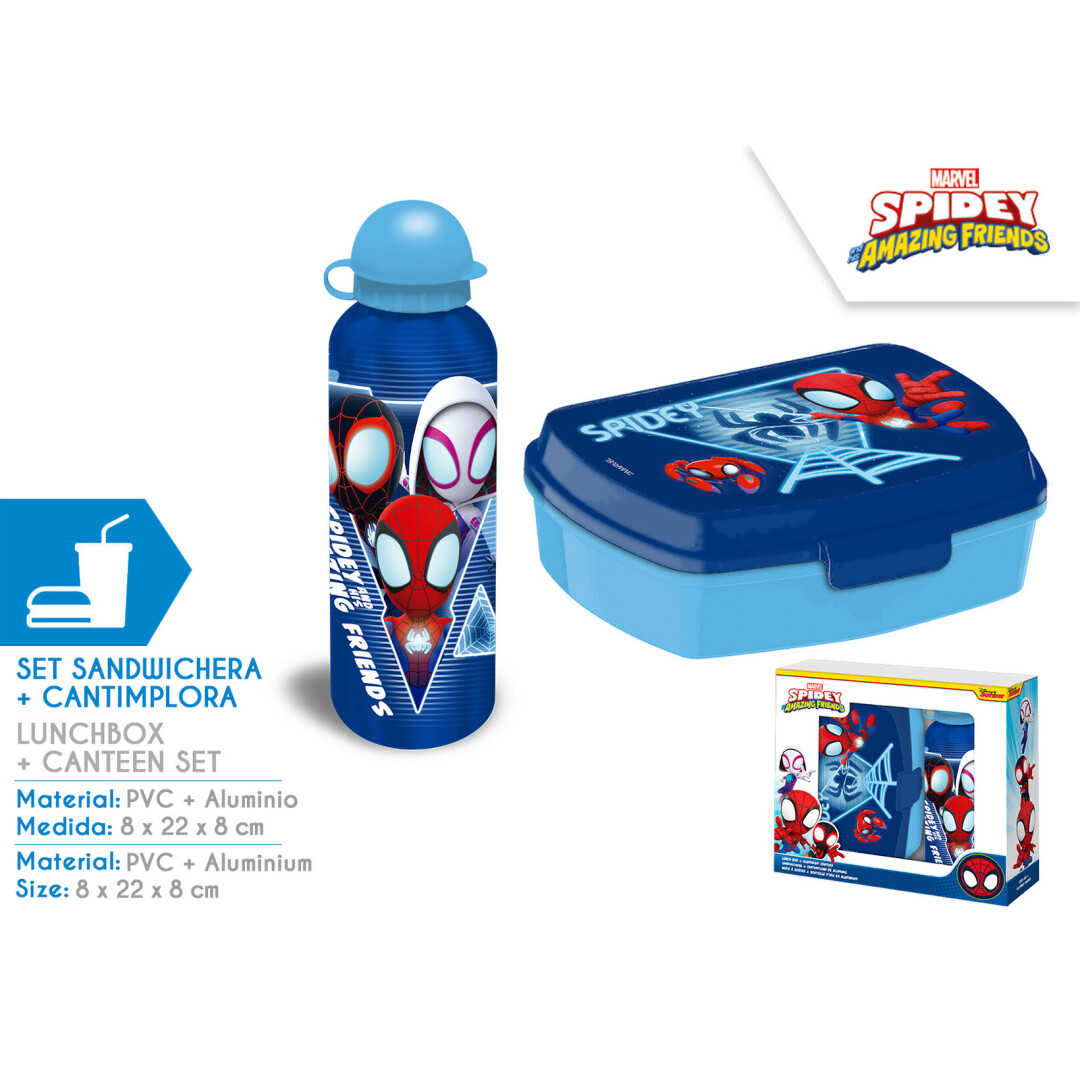 Botella de aluminio con boquilla a presión y portameriendas con diseño de Spidey y sus amigos. Ideal para llevar al cole, excursiones o actividades. Su interior mantiene el frío y su tapón de rosca evita derrames.