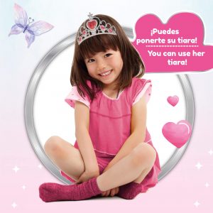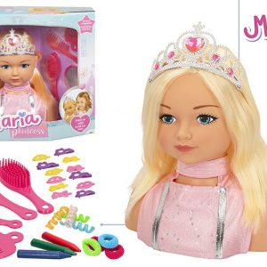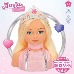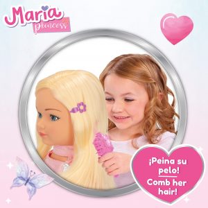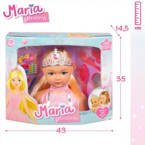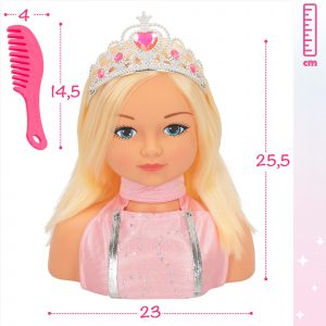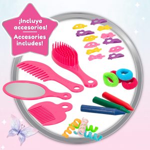 Este busto incluye 2 peines de puas, 1 cepillo, 1 espejo, 3 lápices de colores (verde, azul y rojo), coleteros, rulos y accesorios para adornar su cabello. Además luce una corona brillante de princesa con un collar de tela y un top rosa con detalles brillantes.