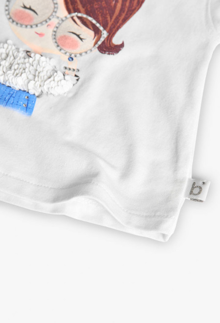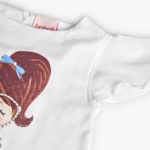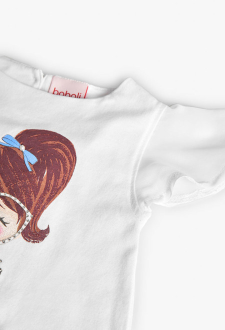 Esta encantadora camiseta blanca de manga corta para niña destaca por sus mangas de seda transparente en volantes, que le aportan un aire delicado y sofisticado. El estampado de una chica con gafas, decorado con perlitas, añade un toque chic y moderno. Perfecta para combinar con jeans, faldas o leggings y crear looks elegantes y a la moda.