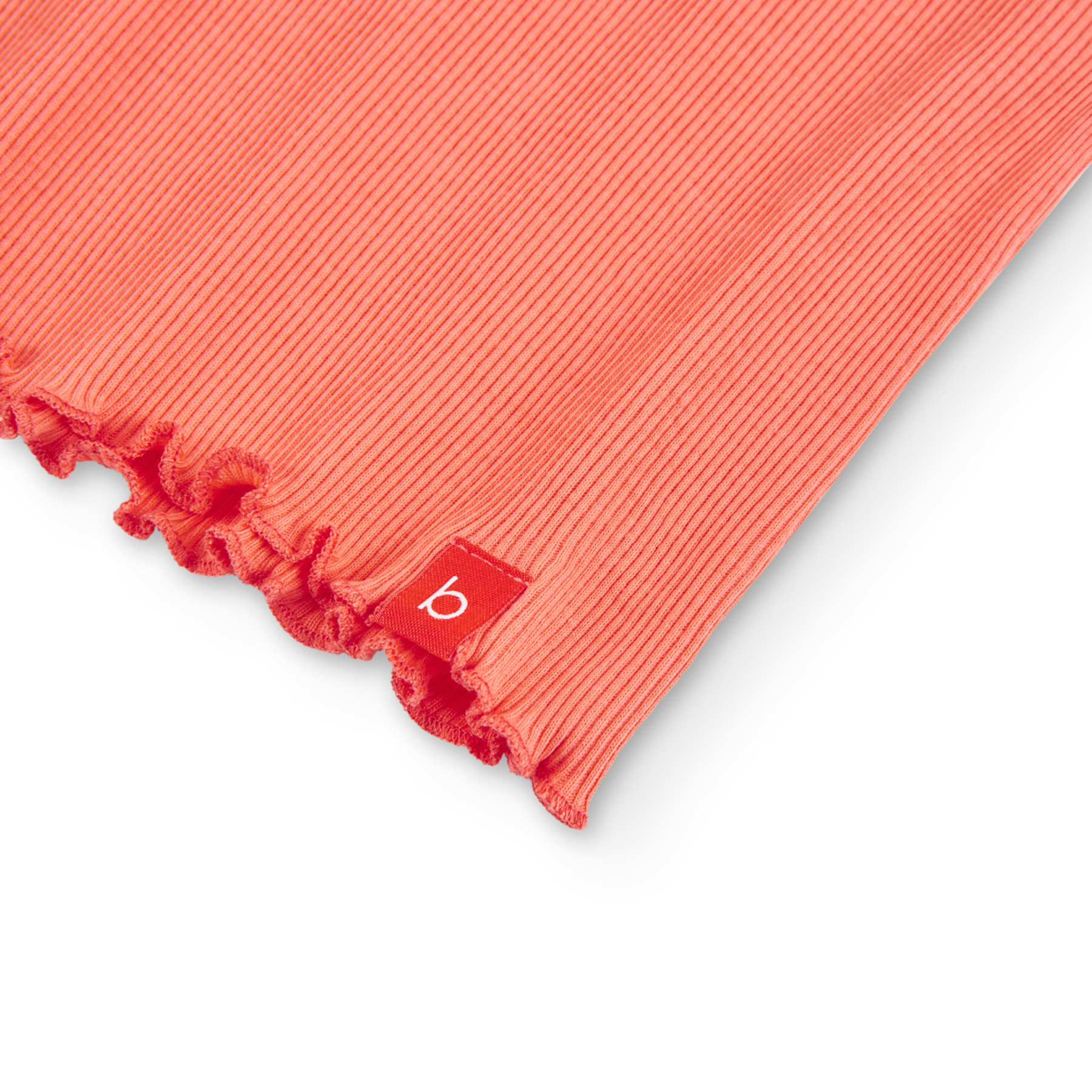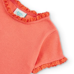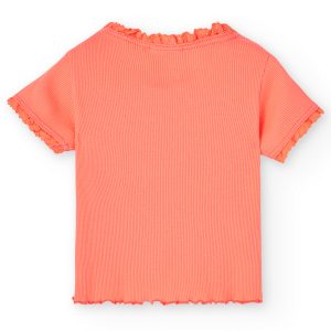 Camiseta de niña en canalé fantasía en color coral, con puntilla elástica al tono en cuello y mangas. Como decoración tiene una etiqueta con detalle de marca.