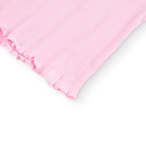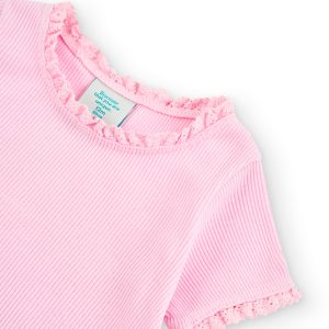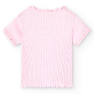 Camiseta de niña en canalé fantasía en color rosa, con puntilla elástica al tono en cuello y mangas. Como decoración tiene una etiqueta con detalle de marca.