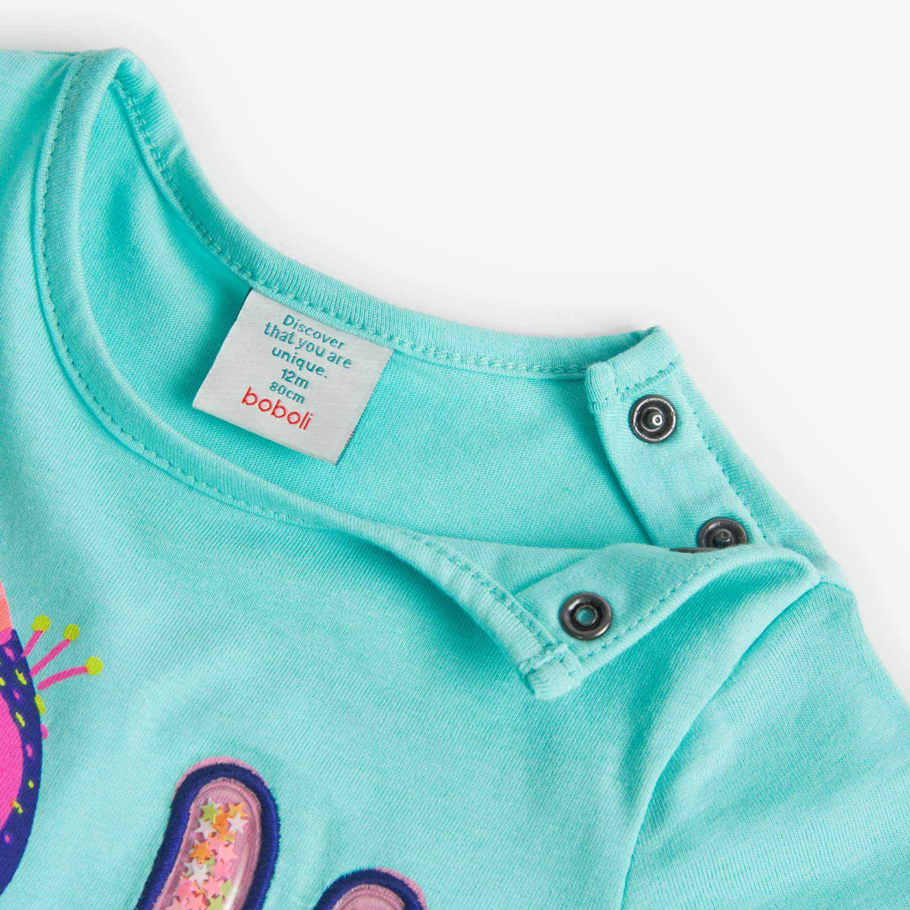 Esta es una camiseta básica de punto para niña, disponible en tallas desde los 6 meses hasta los 8 años. Su diseño sencillo y versátil la hace perfecta para el día a día. El tejido de punto es suave y cómodo, ideal para la delicada piel de los más pequeños. La camiseta es de color azul, un tono que combina con todo y nunca pasa de moda. Tiene un estampado divertido que le da un toque especial. El cuello redondo y las mangas cortas la hacen ideal para el verano. Una prenda básica que no puede faltar en el armario de tu pequeña.