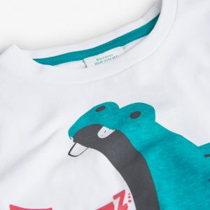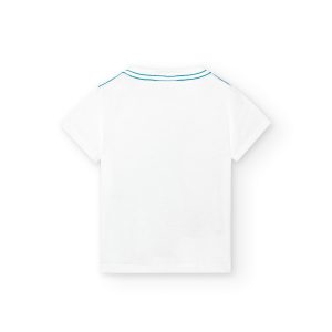 Esta es una camiseta de punto para niño, ideal para el verano. Disponible en tallas desde los 6 meses hasta los 8 años. Su tejido de punto es suave y cómodo, perfecto para la delicada piel de los pequeños. La camiseta es de color blanca, un tono versátil que combina con todo. Tiene un cuello redondo y mangas cortas, lo que la hace fresca y cómoda para los días calurosos. Además, cuenta con un estampado divertido que le añade un toque de alegría. Es una prenda básica y esencial en el armario de cualquier niño.