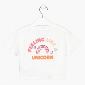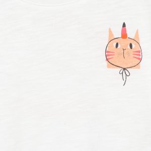 Camiseta de manga corta de color blanco con estampado delantero y trasero de gatito con arcoiris.