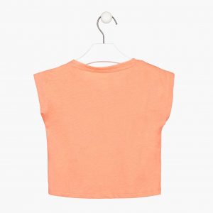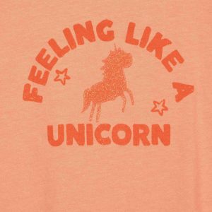 Camiseta de manga corta de color coral con estampado delantero de unicornio.