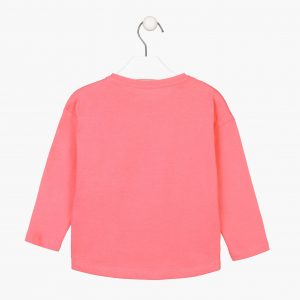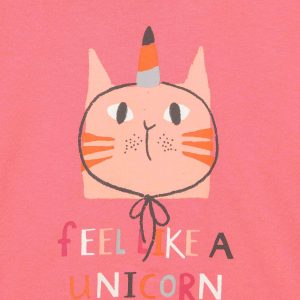 Camiseta de manga larga cuello redondo con estampado delantero de gatito unicornio con letras. Color rosa.
