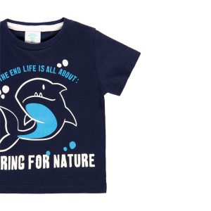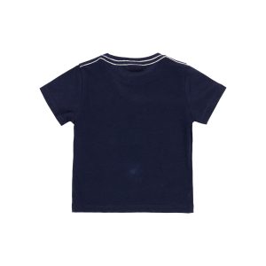 Camiseta de niño de punto liso en color marino. Tiene como decoración un estampado grande de un animal y unas letras, en varios colores .
