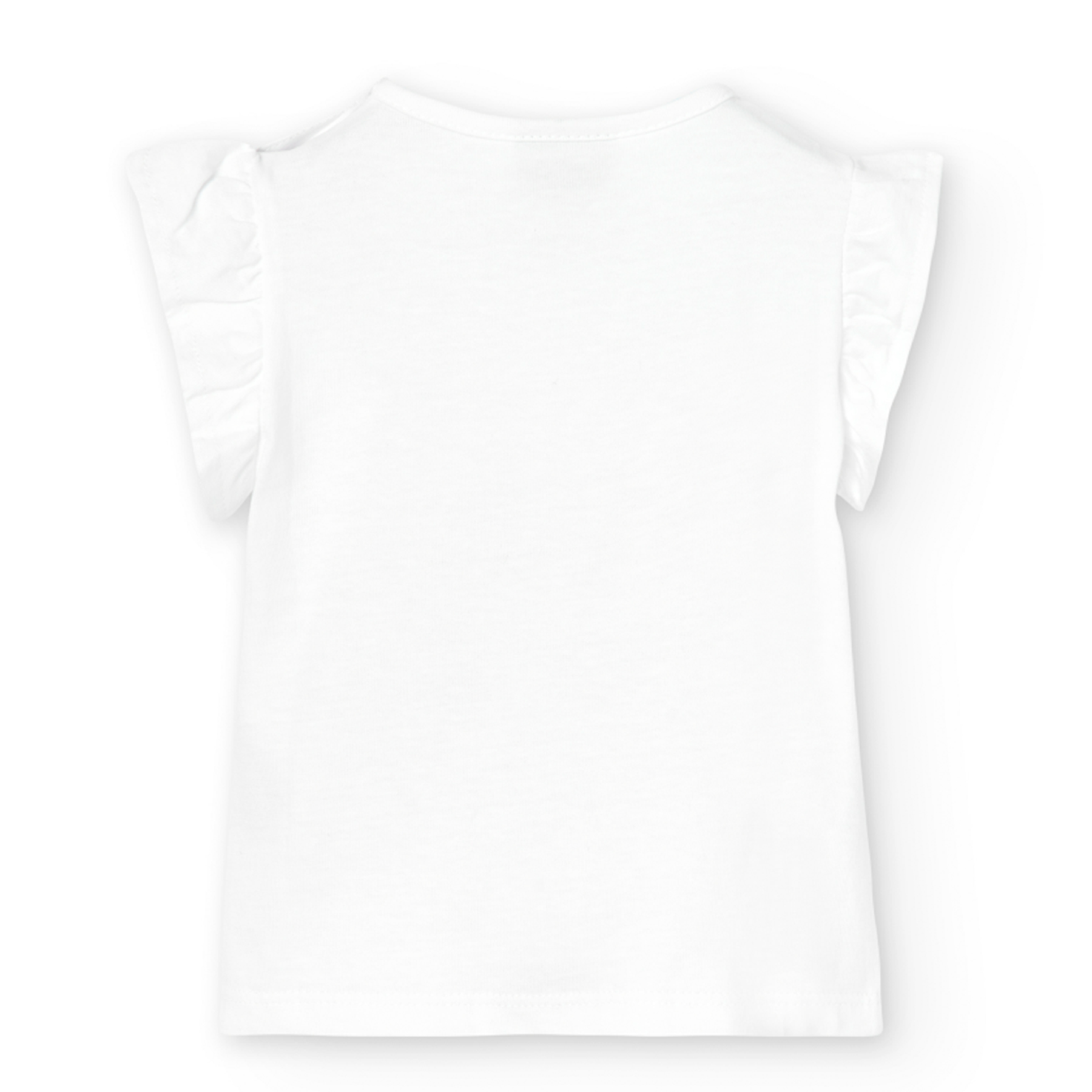 Camiseta de niña en punto liso en color blanco, con cierre a presión en hombro izquierdo, con manga fruncida en forma de volante. Como decoración tiene un estampado en delantero de una niña divertida escuchando música con unas margaritas aplicadas y toques en plata brillante.