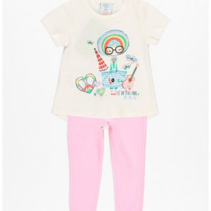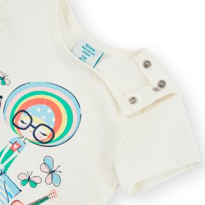 Camiseta de niña en punto liso de color blanco, con mangas de volantes. La decoración es un estampado en varios colores de una niña con una guitarra, y símbolo corazón y paz, junto a una etiqueta de marca en color blanca.