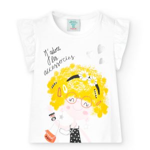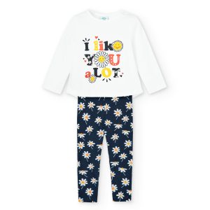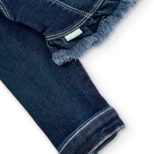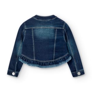 Cazadora de niña en tejano de punto elástico en color azul oscuro , con cierre a presión en delantero y puños, con bajo deshilachado y bolsillos decorativos. La decoración es un estampado en color blanco de unas flores en delantero, junto a una etiqueta con detalle de la marca.