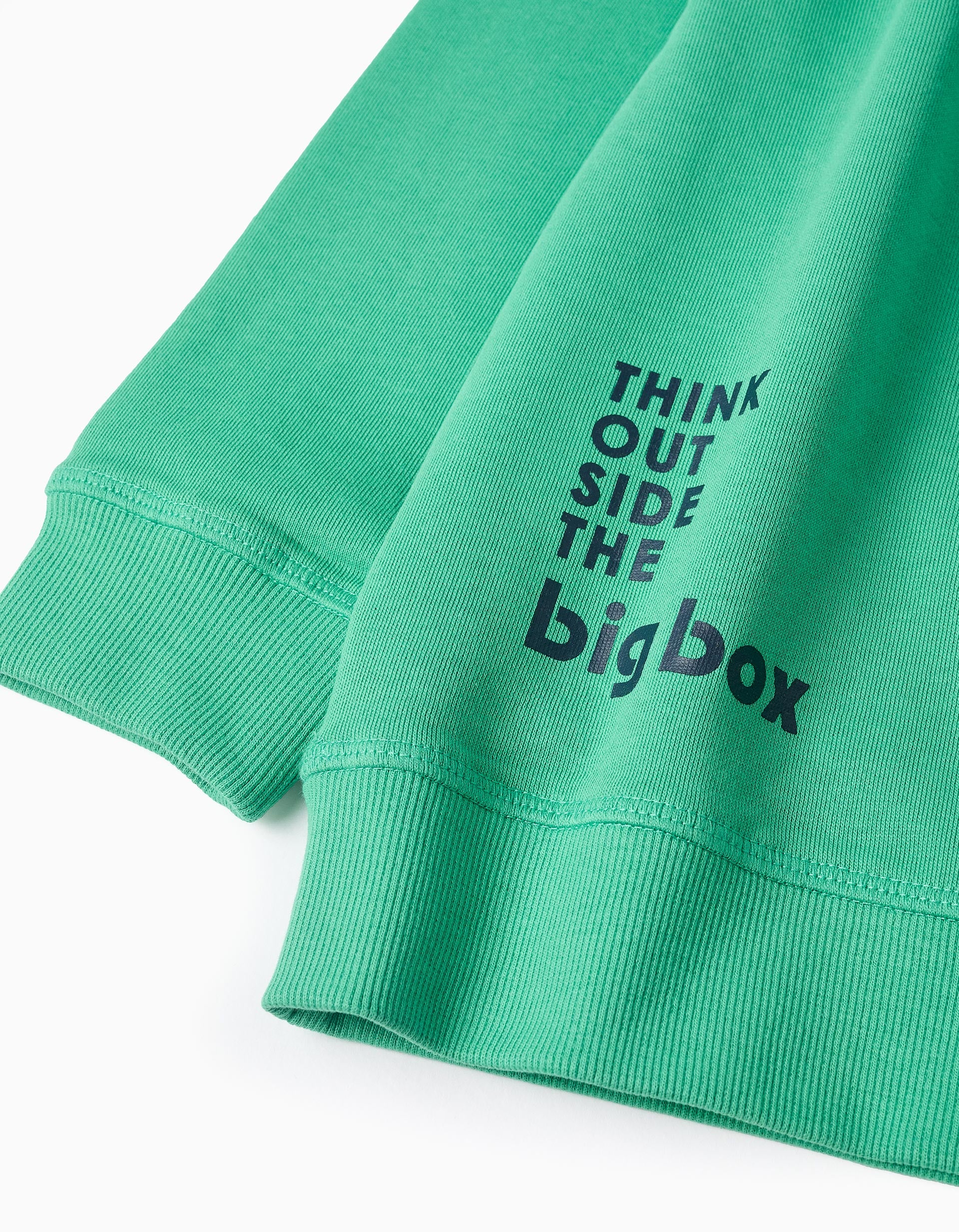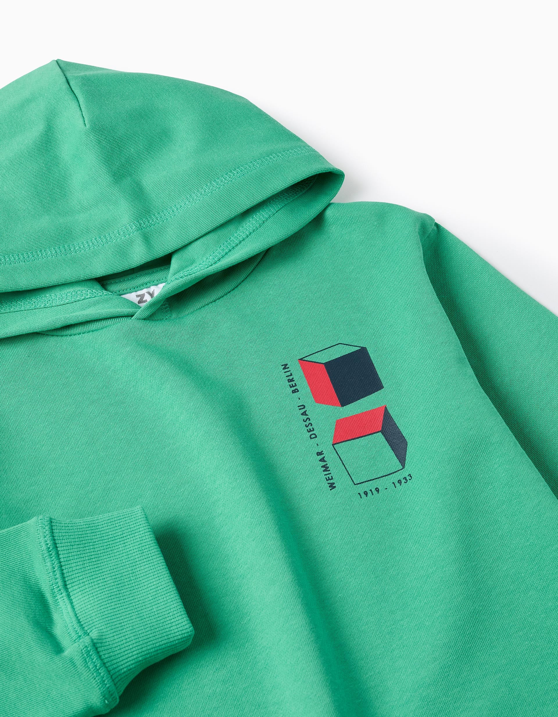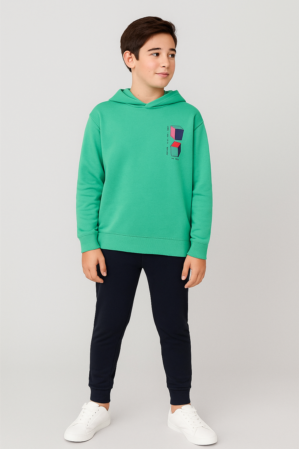 Chándal de dos piezas para niño 100% algodón, compuesto por sudadera con capucha verde y estampado divertido, y pantalón jogger azul marino con bolsillos. Cómodo, moderno y perfecto para el día a día.