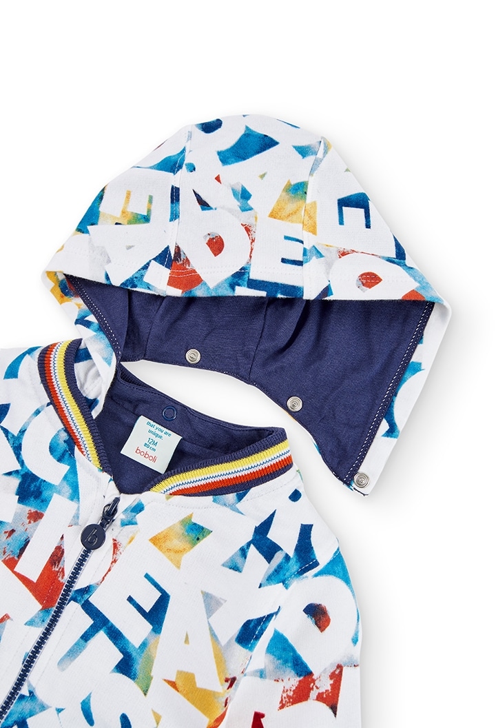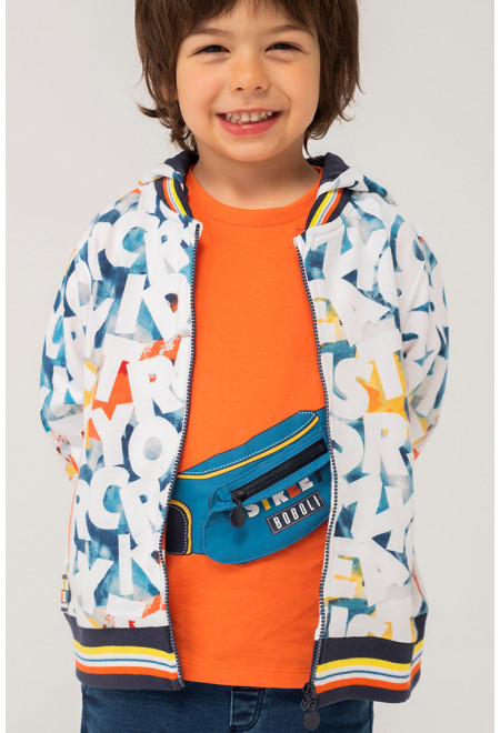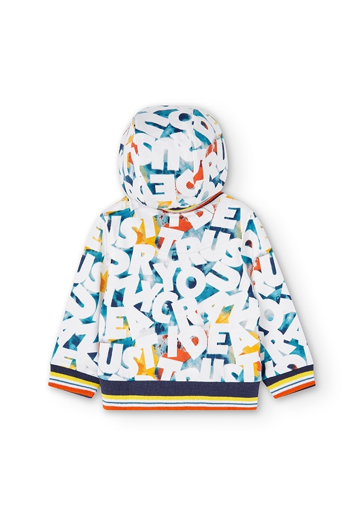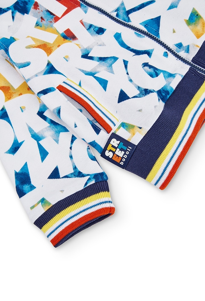 Chaqueta de niño de felpa estampada con letras blancas y fondo en varios colores. El cuello, los puños, el bajo y los bolsillos son de canalé azul marino listado en colores naranja, amarillo, azul y blanco. Se cierra con una cremallera bicolor, azul marino y blanco. Lleva una capucha desmontable con cierres a presión, forrada en punto liso en color azul marino. Tiene una etiqueta decorativa con detalle de la marca.