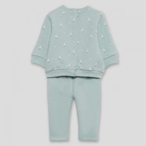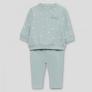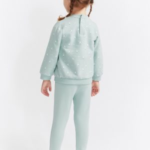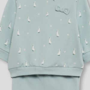 Conjunto de dos piezas para bebé niña, pensado para ofrecer comodidad y estilo en los meses más fríos. La sudadera, en color eucalipto, está elaborada en punto suave y luce un tierno estampado de patitos junto con un lazo decorativo en el pecho. Su cierre trasero con botones facilita el cambio en las tallas más pequeñas. Los leggings a juego, en color liso eucalipto, están confeccionados en punto elástico que se adapta con suavidad al cuerpo, aportando libertad de movimiento.