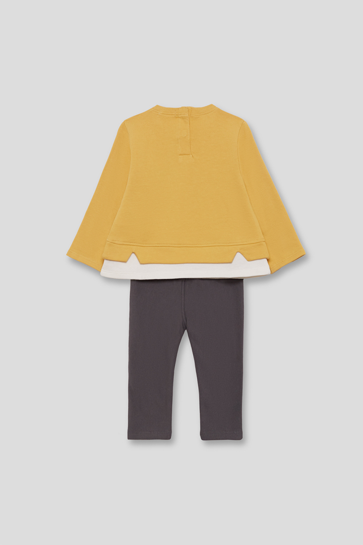 El conjunto se completa con unos leggings en gris oscuro, confeccionados en tejido afelpado elástico que se adapta al cuerpo y ofrece libertad de movimiento. Su cintura elástica asegura un ajuste cómodo durante todo el día.