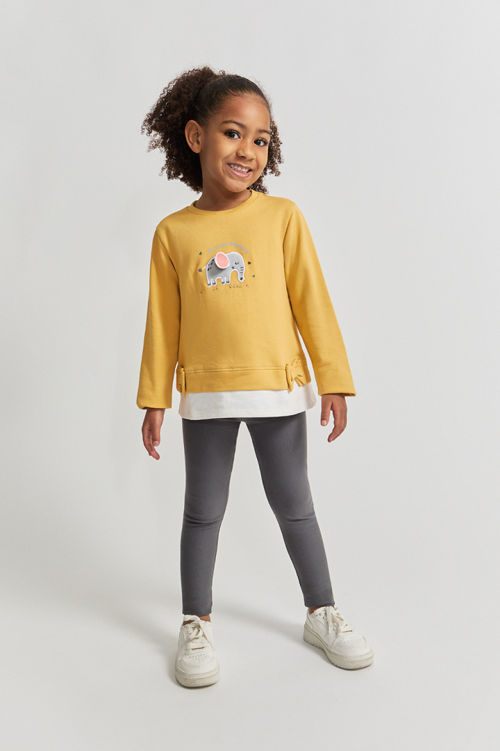 La sudadera, en un tono maíz cálido y alegre, luce un estampado de elefante con bordados, que añade un toque tierno y especial. El bajo incorpora una doble capa con volante blanco y lazos decorativos a los lados, creando un encantador efecto blusón.