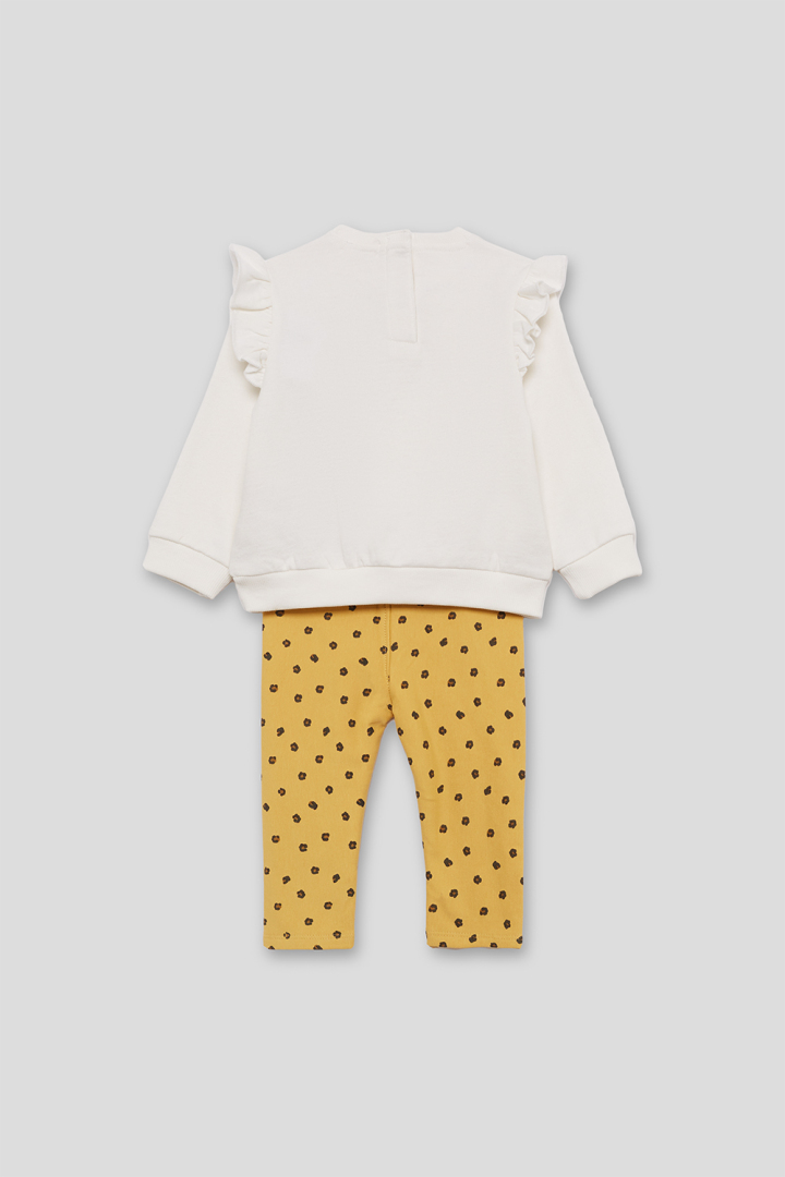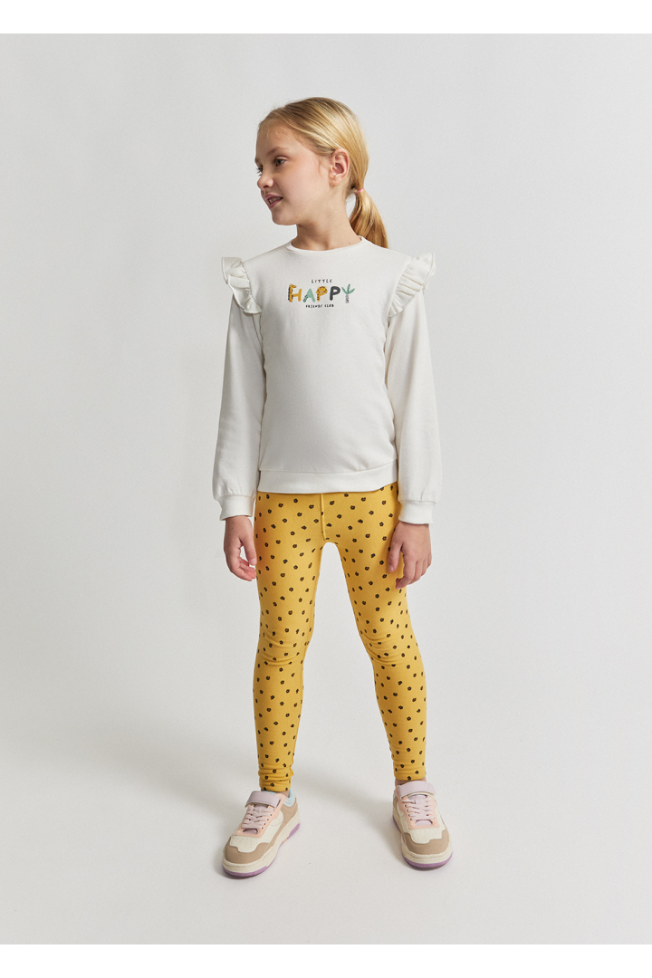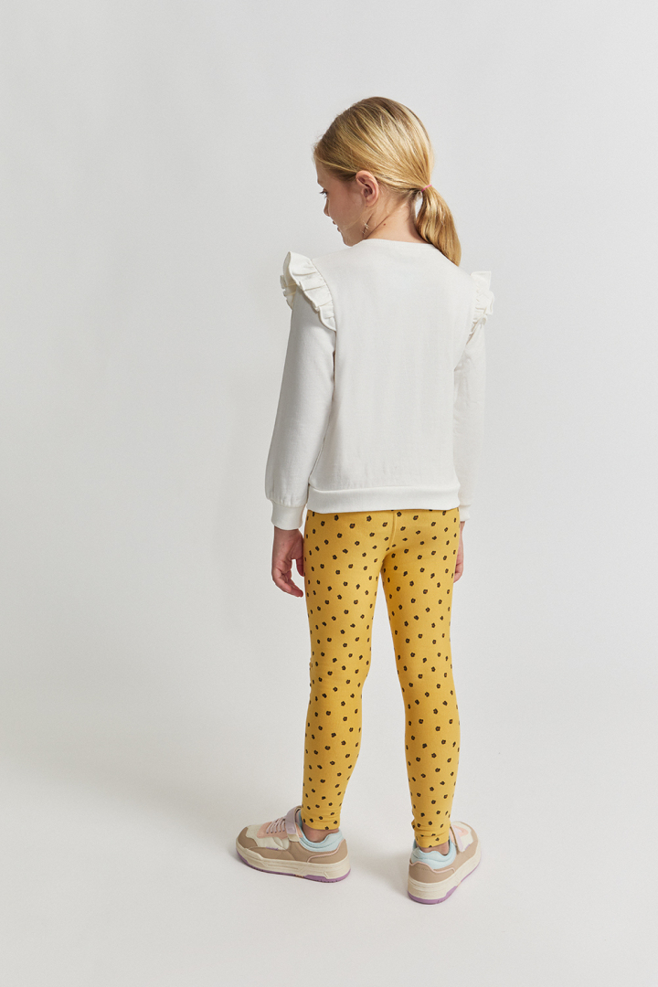 Los leggings, en color maíz, llaman la atención por su divertido estampado de mini corazones en contraste. Están confeccionados en un tejido afelpado suave y elástico, con cintura adaptable para que la niña se mueva libremente y sin molestias.