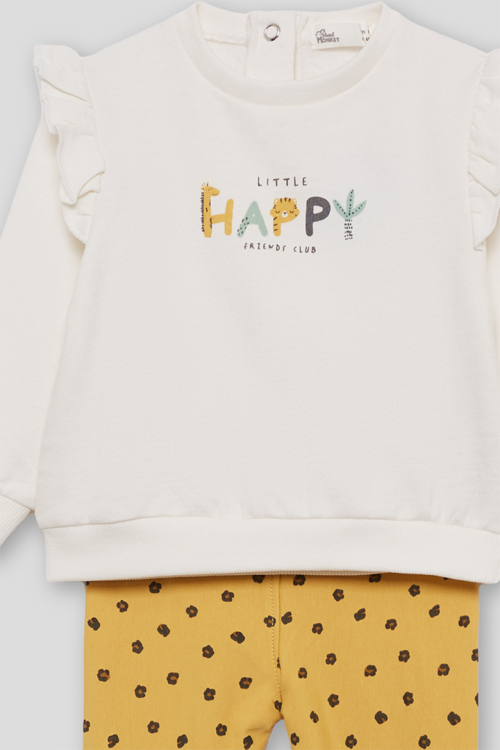 La sudadera, en un bonito tono crudo, destaca por sus volantes decorativos en los hombros y el mensaje bordado “Little Happy Always Club” en el pecho. Las letras están decoradas con pequeños motivos florales, aportando un aire dulce y divertido. Los puños y el bajo de canalé aseguran un ajuste suave y cómodo. Además, en las tallas de meses incorpora cierre de botones en la espalda para facilitar la puesta.