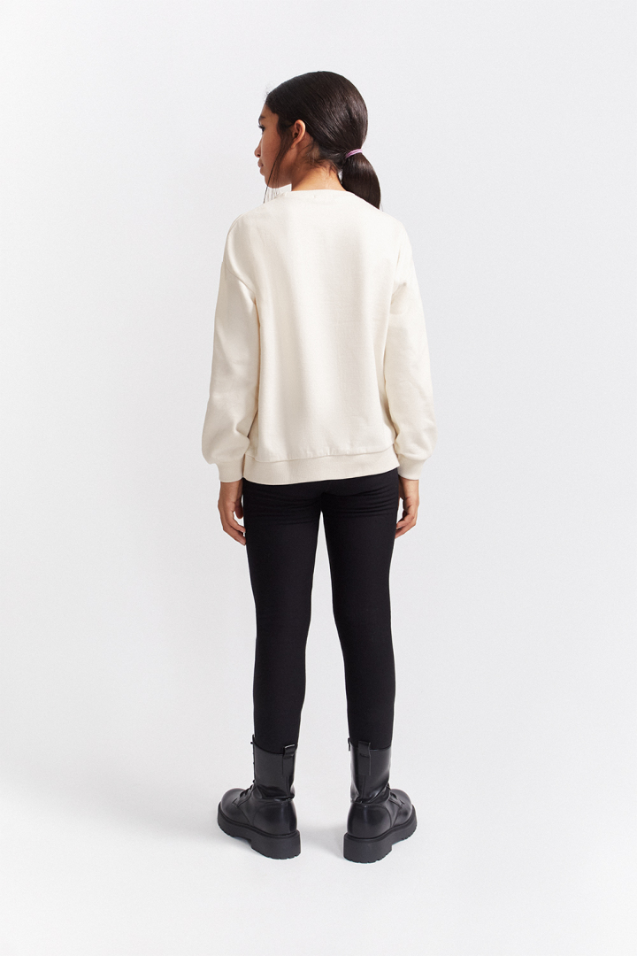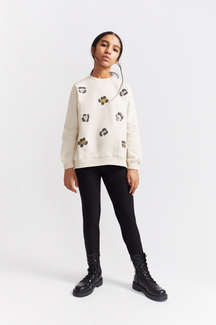 La sudadera, en color blanco roto, está confeccionada en tejido suave con cuello redondo, puños y bajo de canalé. Destaca su estampado de huellas con brillos en tonos dorado y negro en la parte frontal, que aporta un toque original y moderno. La espalda es completamente lisa para mayor comodidad.