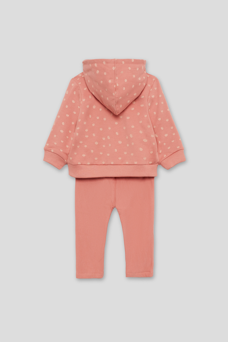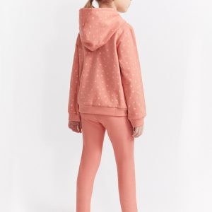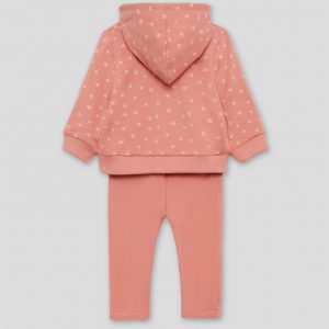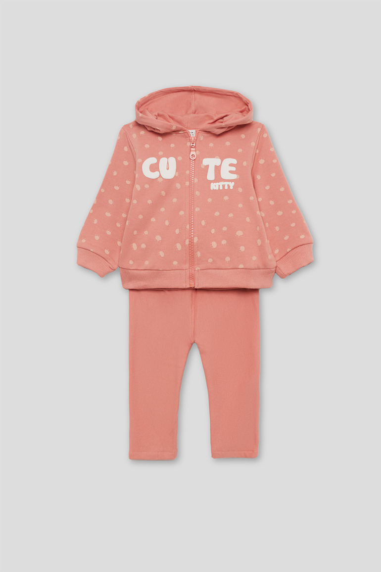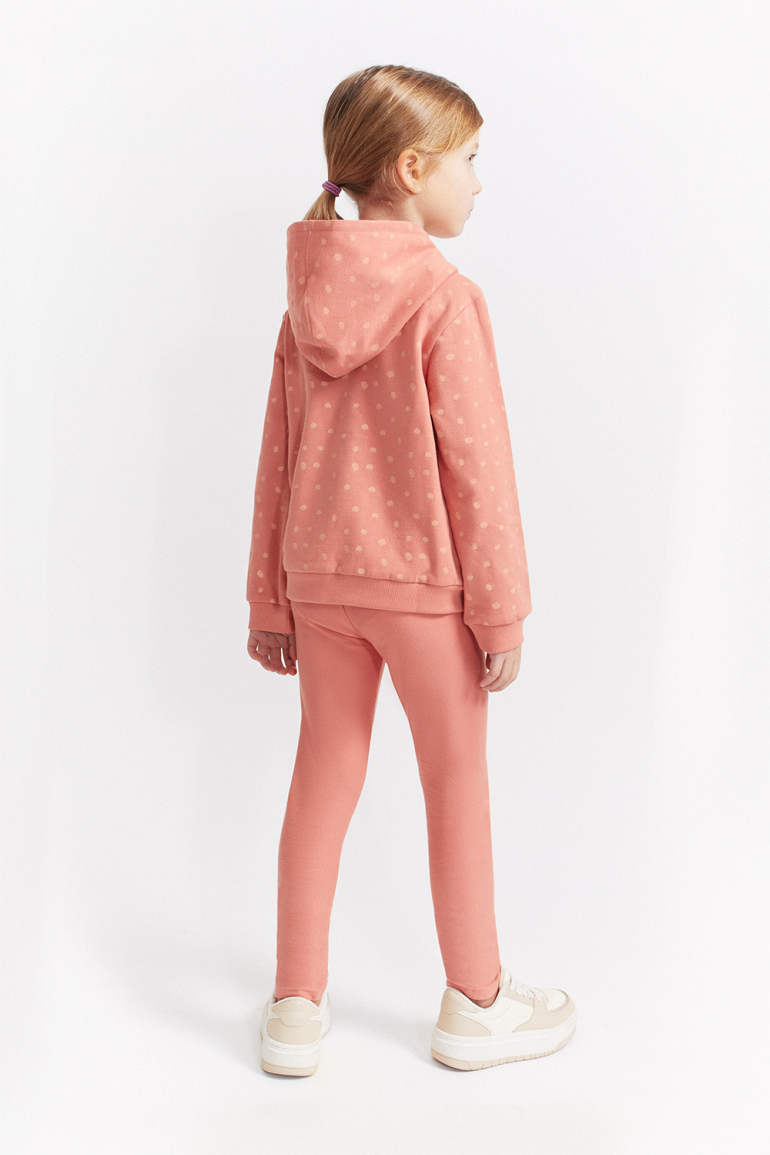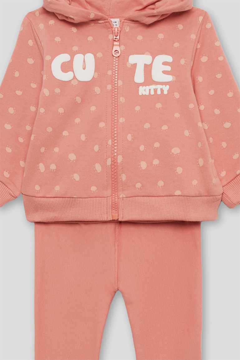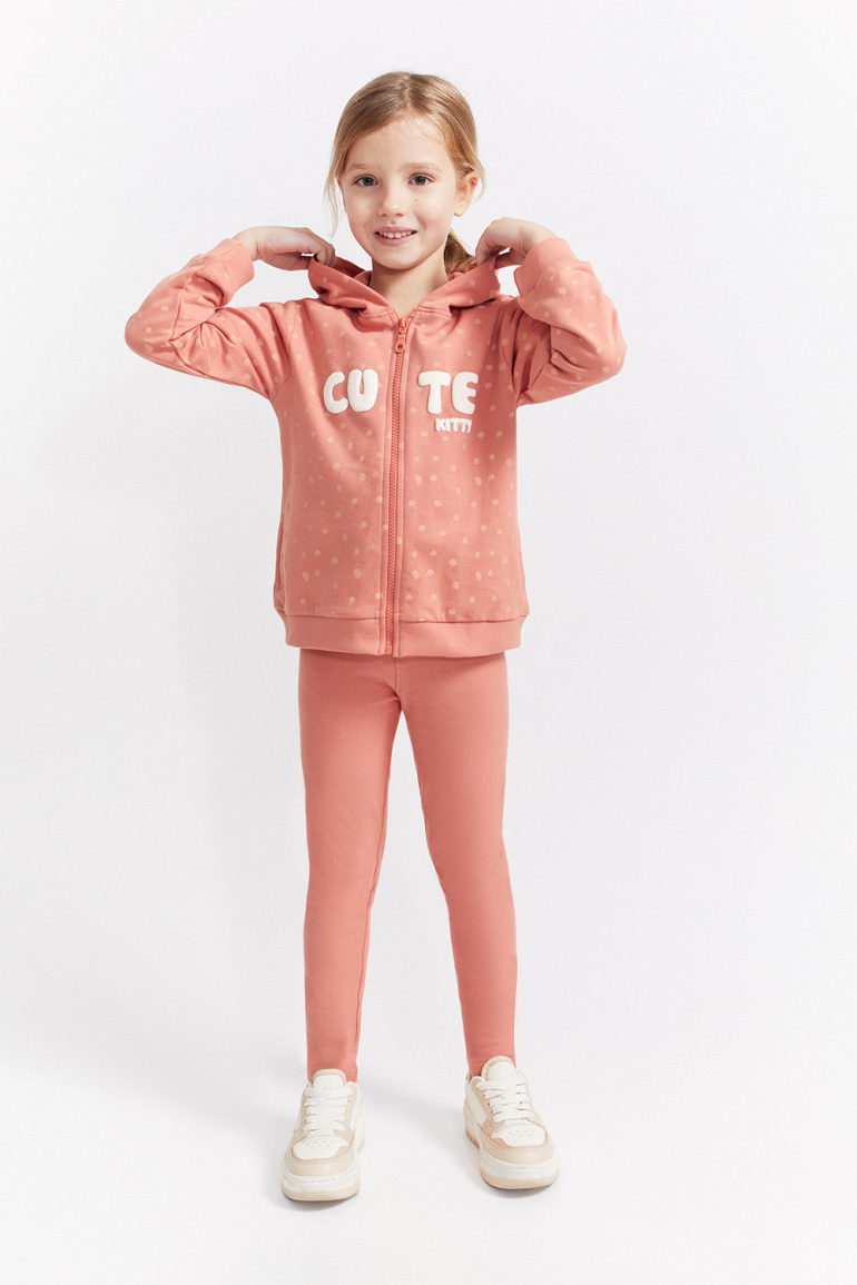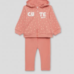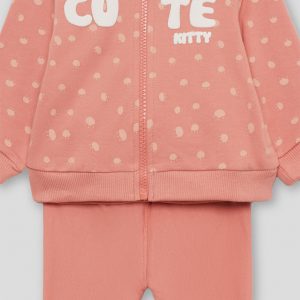 Conjunto de dos piezas, sudadera con capucha en color maquillaje con lunares, cremallera central y texto “CUTE KITTY” en relieve, acabados en canalé en puños y bajo. Se combina con leggings lisos a juego, de cintura elástica. Tejido de felpa suave y calentita, ideal para los meses fríos