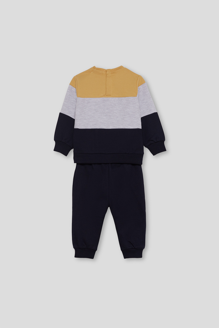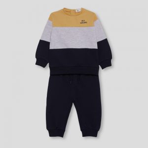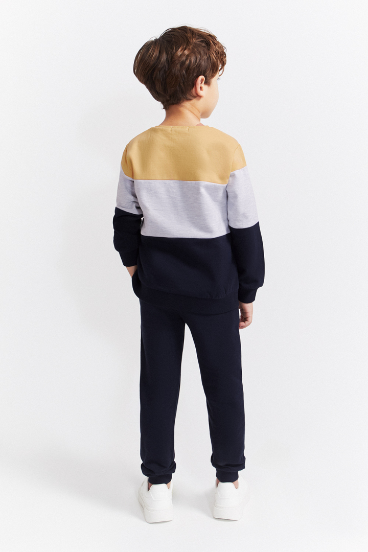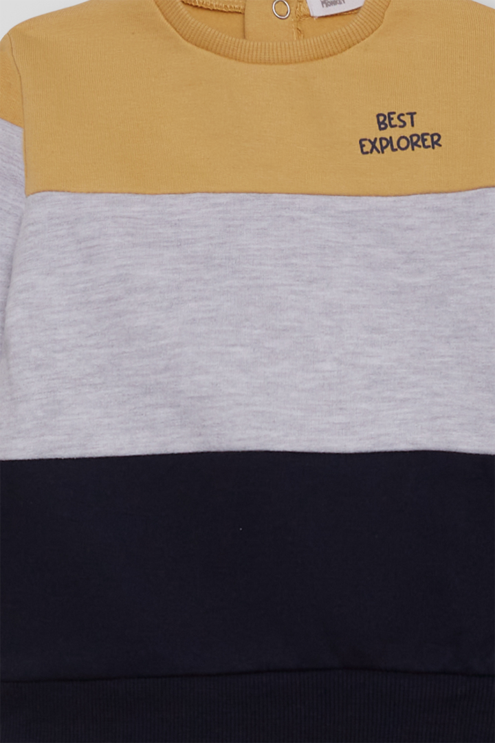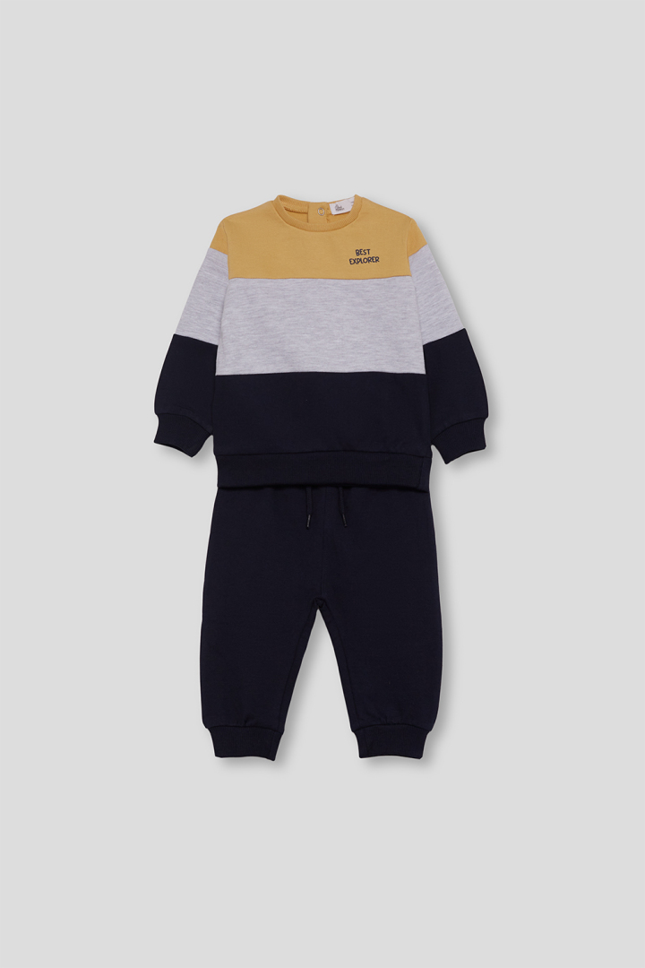 Conjunto de dos piezas para niño. Sudadera, confeccionada en felpa perchada muy suave, destaca por su diseño color block en tonos maíz, gris vigoré y azul noche. Además, en el centro lleva el mensaje bordado “Best Explorer”, que invita a soñar y explorar. El cuello redondo y los puños elásticos garantizan un ajuste cómodo para su día a día.