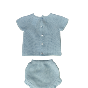 La braguita tejida, confeccionada con el mismo punto suave, completa este conjunto con un toque de dulzura. El detalle de volante en la parte inferior añade un toque de delicadeza y estilo encantador, perfecto para las primeras aventuras de tu pequeño tesoro.