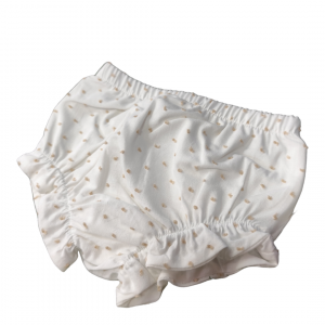La braguita tejida, confeccionada con el mismo punto suave, completa este conjunto con un toque de dulzura. El detalle de volantes en la parte inferior añade un toque de delicadeza y estilo encantador, perfecto para las primeras aventuras de tu pequeño tesoro.