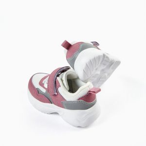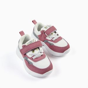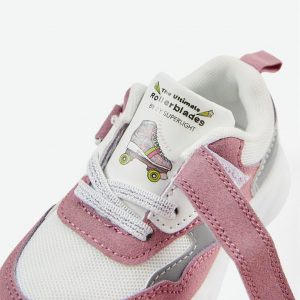 Zapatillas de piel sintética para bebé niña de color blanco, rosa y gris. Cierre con cordones elásticos y trabilla autoadherente, para calzar con facilidad. Interior de mesh para una mayor transpirabilidad. Suela chunky, muy ligera y antideslizante para una mayor seguridad y confort. Unas zapatillas cómodas y divertidas, con patines como plano de fondo. Big Me: plantillas con semicírculos para que tu hijo identifique por sí mismo el pie correspondiente, promoviendo su autonomía.