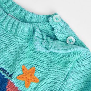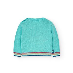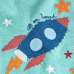 Jersey de bebé niño de tricotosa en color turquesa con una decoración frontal de un cohete y estrellas en aplicaciones bordadas en varios colores. Se abrocha con botones en el hombro. Lleva como decoración una etiqueta con detalle de la marca.
