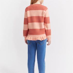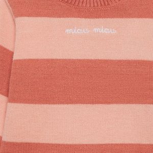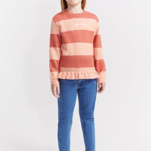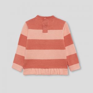 Confeccionado en punto suave, destaca por sus rayas anchas en tonos rosa claro y coral que llenan de color cualquier look otoñal o invernal. Además, cuenta con un cuello redondo y acabados de canalé en puños y bajo que aseguran un ajuste cómodo y favorecedor.