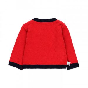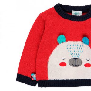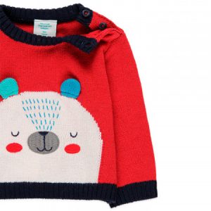 Jersey de punto en color rojo con estampado de oso en la parte delantera. Orejas bicolor en azul. Fruncido elástico en la zona del cuello, extremos de las mangas y cintura para un máximo confort.