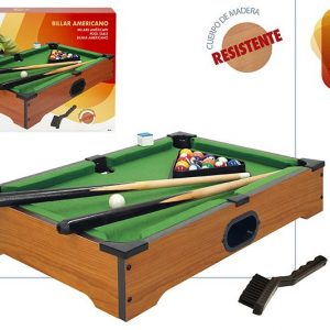 Diseño: réplica en miniatura de la clásica mesa de billar americano con el tapete de terciopelo verde y una estructura resistente fabricada en madera