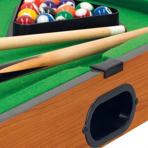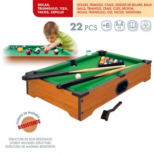 Incluye 22 piezas: 1 mesa portátil de 51x31x9 cm, 1 triángulo de 15 cm, 2 palos de 48 cm, 15 bolas de 2,54 cm de diámetro, 1 taco de 2,3 cm y 1 cepillo de 17×4 cm
