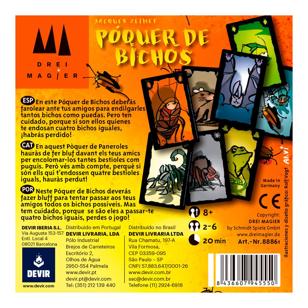 Póker de Bichos es un emocionante juego de cartas en el que la mentira y el engaño son esenciales. Los jugadores deben pasar cartas a sus oponentes asegurando que contienen un tipo de bicho determinado… pero, ¿estarán diciendo la verdad o estarán mintiendo? La clave del juego es detectar los engaños de los demás mientras intentas ocultar los tuyos.