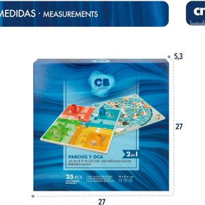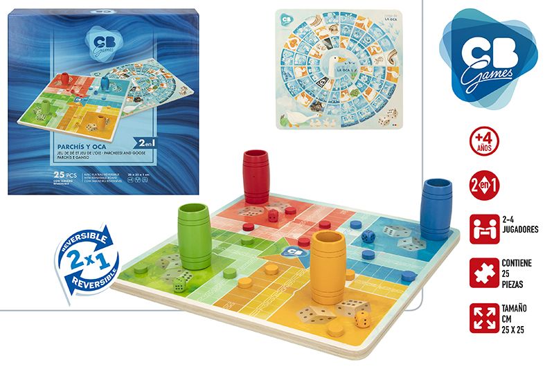 Disfruta del Juego de Parchís y Oca CB Games, un clásico de los juegos de mesa fabricado en madera natural. Con un tablero reversible de 25×25 cm, fichas, cubiletes y dados, es perfecto para compartir en familia y mejorar habilidades cognitivas desde los 4 años.