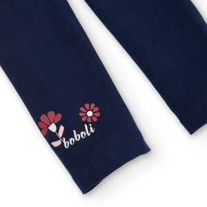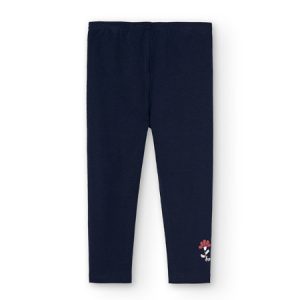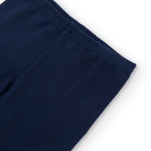 Leggings de punto elástico de niña en color marino, se ajusta con goma. La decoración es un pequeño estampado en varios colores con detalle de la marca.