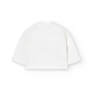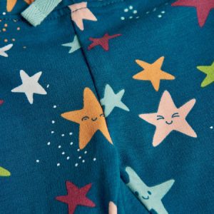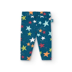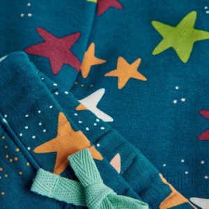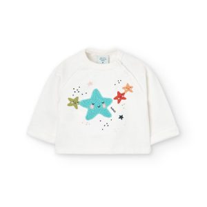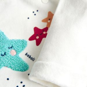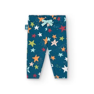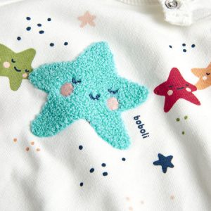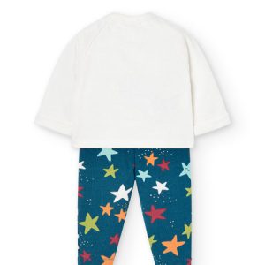 Conjunto sudadera y pantalones de bebé niña. La sudadera de felpa es en color blanco con decoración de estrellas estampadas y bordadas. Se abrocha por un hombro con cierres a presión. El pantalón de felpa elástica en color azul con un estampado de estrellas en diferentes colores. Se ajusta con goma en la cintura y cordón en color turquesa. Lleva una etiqueta con detalle de la marca.