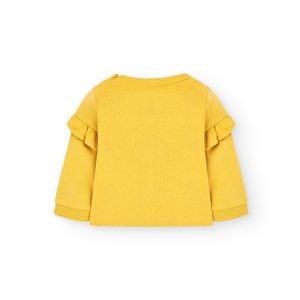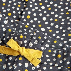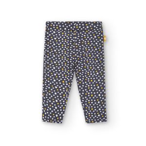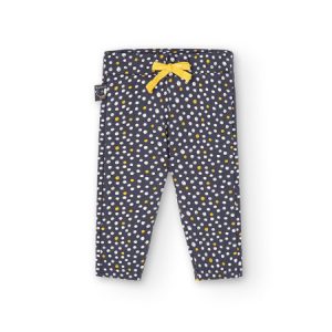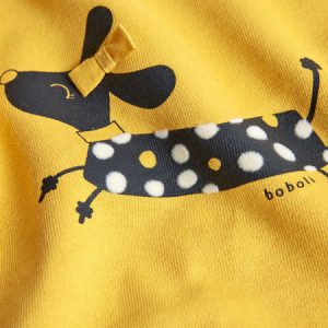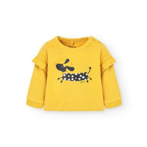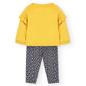 Conjunto de sudadera y pantalón para bebé niña. La sudadera de felpa en color ocre, lleva como decoración un estampado de un perro con un lazo aplicado. El pantalón es de felpa elástica en color gris oscuro y con estampado de topos en blanco y ocre que se ajusta con goma en la cintura y cordón en color ocre.
