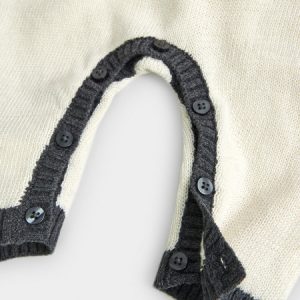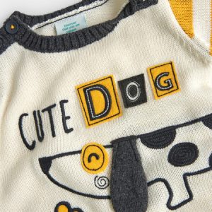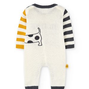 Pelele de bebé unisex de tricotosa en color blanco con mangas de rayas en ocre, blanco y gris oscuro. Lleva decoración de un perro, hecho con aplicaciones bordadas en el delantero. En la costura lateral lleva una decoración de etiqueta con detalle de la marca. Se abrocha con botones en los hombros y cierres a presión en la entrepierna.