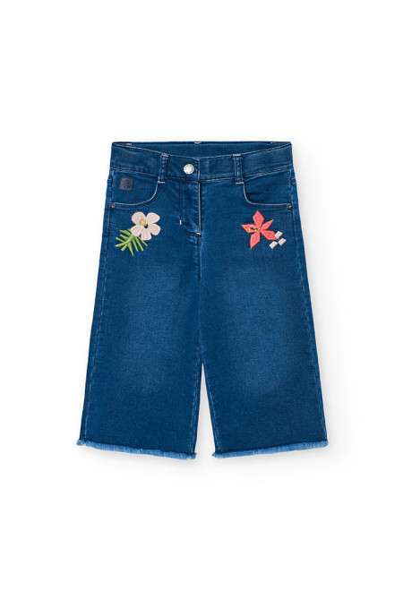 Pantalón azul bordado niña. Este Pantalón azul bordado niña De color azul, presenta bordados coloridos que aportan un toque divertido y alegre.